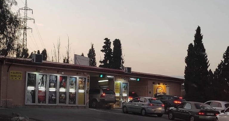 Disfruta de tu película con nuestros refrescos fríos, hamburguesas recién hechas, patatas fritas, snacks y mucho más. ¡Te lo llevamos directamente a tu coche para que no te pierdas nada!